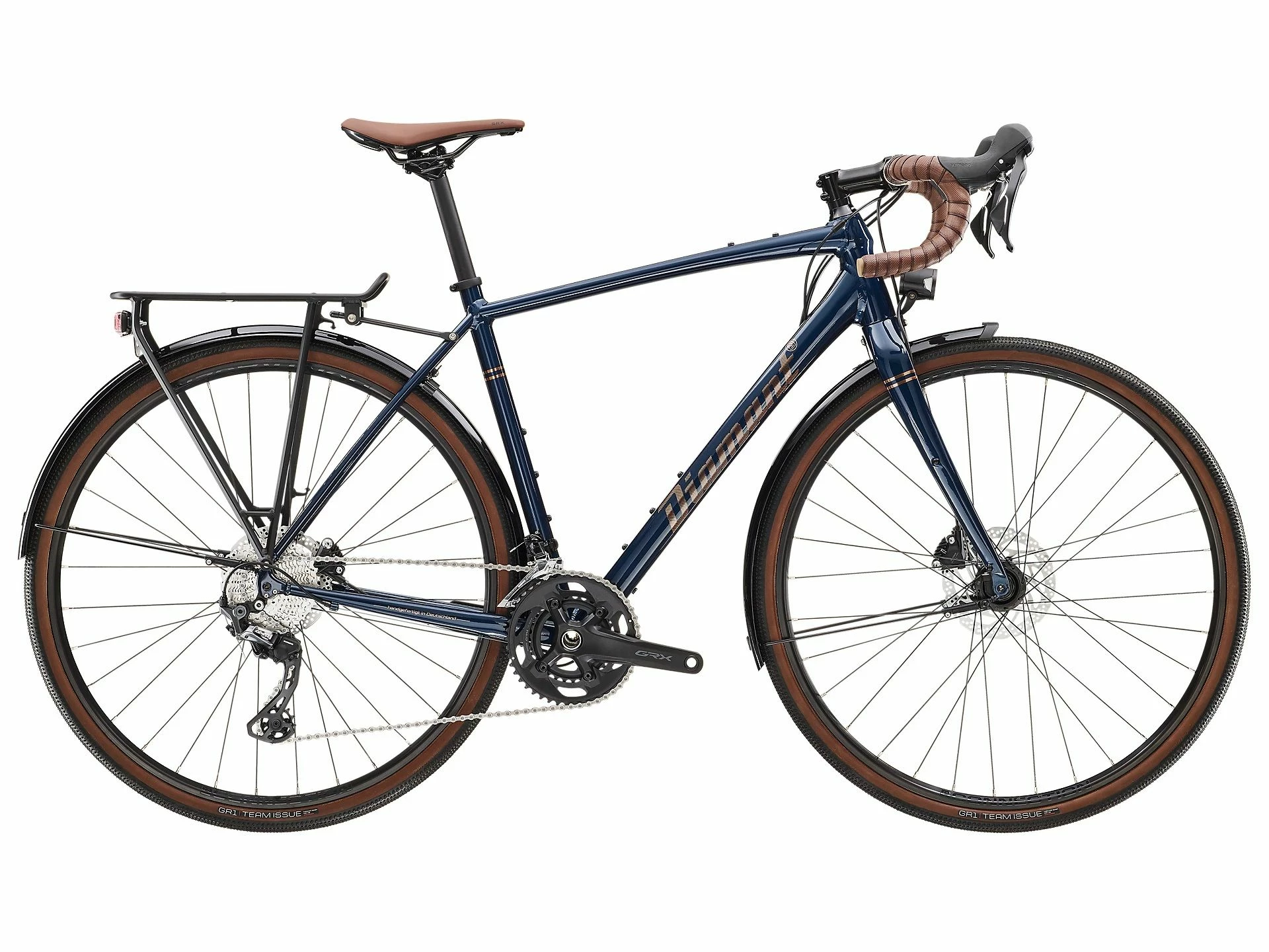 Der Aluminiumrahmen bietet viele Befestigungsmöglichkeiten für Zubehör. Komfort kommt von einer hochwertigen Carbon-Gabel. Die GRX-Schaltung von Shimano bleibt auch im Gelände zuverlässig. Hochwertige Scheibenbremsen verzögern optimal dosiert. Alltagstauglich ist die zuverlässige Beleuchtung. Die sorgsam abgestimmten Retro-Komponenten sind einzigartig.